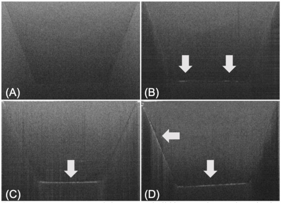 Representative swept-source optical coherence tomography (SS-OCT) images with a varying degrees of interfacial gap formation. Gap formation appears as bright spots and is highlighted by the white arrows. (A) Almost no gap formation, typical for immediate and 24-h observations of groups with CP pretreatment. (B) Minor gap formation at the cavity bottom, characteristic for warm air-dried groups of CP + UBQ after the 1 year of water storage. (C) Extensive gap formation at the cavity bottom, representative of UBQ groups without CP and thermocycled specimens of CP(N)UBQ(N). (D) Extensive gap formation at the cavity bottom and lateral walls, observed in specimens shortly before detachment from cavities.