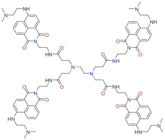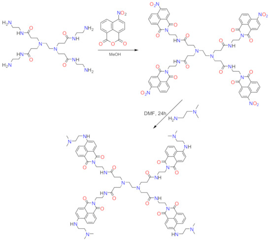 - Grabchev, I.; Chovelon, J.-M.; Bojinov, V.; Ivanova, G. Poly(amidoamine) dendrimers peripherally modified with 4-ethylamino-1,8-naphthalimide. Synthesis and photophysical properties. Tetrahedron 2003, 59, 9591–9598. [Google Scholar] [CrossRef]