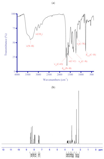The 1H NMR and IR spectra of the FCD molecule alone are presented in Figure 3a,b. The FCD molecule’s structure and atom number are presented in Figure 4. The SEM and TEM images of the FCD molecule alone are given in Figure 5a,b. The frequencies of the characteristic IR bands for FCD (cm−1) were 3365 ν(N−H), 3070 νas(C−H)aromatic, 2953 νas(CH2), 2833 νs(CH2), 1700 νas(C=O), 1657 δdef(N−H), 1624 νs(C=O), 1588 and 1549 ν(C=C), 1440 δsciss(CH2), 1385 δrock(CH2), 1347 δsciss(CH3), 1239 νas(C−N), 1190 νs(C−N), 1047 δrock(N−H), 982 δrock(CH3), 960 δwag(CH2), 850 δwag(N−H), 783 δrock(C−H)aromatic, and 537 δtwist(CH2). The eight (N−H) groups in the FCD molecule gave a strong intensity, broad band ranging from 3580 to 3170 cm−1 with a maximum intensity at 3365 cm−1. This broad band was assigned to the N−H stretching vibrations. Also, the N−H band gave three additional absorption bands. A very strong, narrow band vibrated at 1657 cm−1 due to the δdef(N−H) modes. The two medium bands at 1047 and 850 cm−1 were attributed to the rocking and wagging bending vibrations of the N−H band, respectively [84,85,86,87,88].