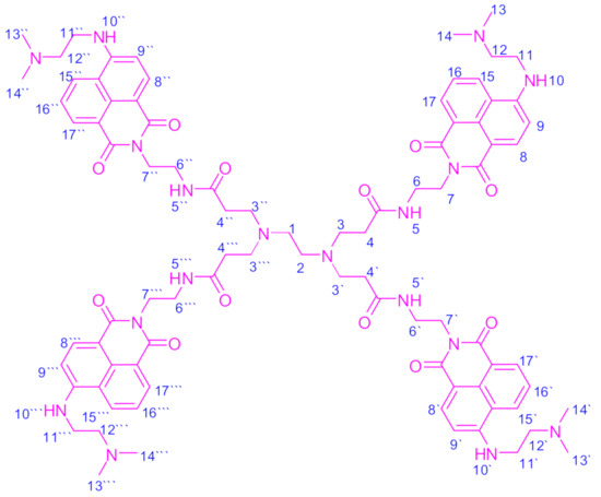 - Grabchev, I.; Petkov, C.; Bojinov, V. Infrared spectral characterization of poly(amidoamine) dendrimers peripherally modified with 1,8-naphthalimides. Dyes Pigm. 2004, 62, 229–234. [Google Scholar] [CrossRef]