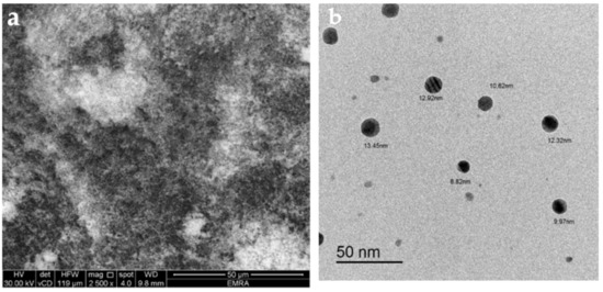 (a) Scanning electron microscopy (SEM) and (b) transmission electron microscopy (TEM) micrographs of the synthesized FCD.