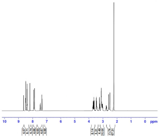 The observed spectrum of the complex contained the following chemical shifts (in ppm): δ = 2.23 (s, 24H, 8CH3), 2.60 (s. 4H, 2(CH2)1,2), 2.77 (t, 8H, 4(CH2)4,4′,4′′,4′′′), 3.03 (t, 8H, 4(CH2)12,12′,12′′,12′′′), 3.24 (t, 8H, 4(CH2)7,7′,7′′,7′′′), 3.44 (t, 8H, 4(CH2)11,11′,11′′,11′′′), 3.68 (t, 8H, 4(CH2)3,3′,3′′,3′′′), 3.72 (t, 8H, 4(CH2)6,6′,6′′,6′′′), 7.37 (d. 4H, 4(ArCH)9,9′,9′′,9′′′), 7.43 (dd. 4H, 4(ArCH)16,16′,16′′,16′′′), 7.90 (d. 4H, 4(ArCH)8,8′,8′′,8′′′), 8.31 (s, 4H, 4(NH)10,10′,10′′,10′′′), 8.46 (d. 4H, 4(ArCH)15,15′,15′′,15′′′), 8.50 (d, 4H, 4(ArCH)17,17′,17′′,17′′′), and 8.66 (s, 4H, 4(NH)5,5′,5′′,5′′′).