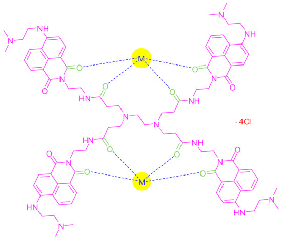 Figure 8 depicts the proposed structure of the synthesized complexes based on the analytical, IR and 1H NMR spectral results. In this proposed structure, the eight oxygen atoms of the (C=O) groups in the FCD molecule covalently bonded to two metal ions (M2+) and four chloride ions (Clˉ) equivalent to the positive charges of the metal ions. As such, the complexes were composed of [M2FCD]·4Cl (M: metal ion, FCD: synthesized fluorescent dendrimer). The stereochemistry around each metal in the complex was square planar.