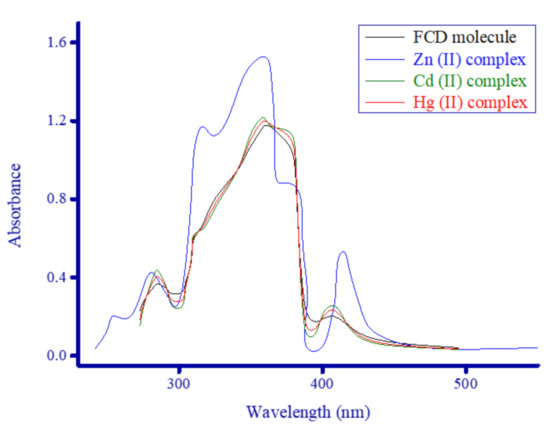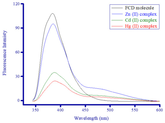 To obtain a complete comparative picture of the influence of Zn2+, Cd2+, and Hg2+ ions on the photophysical properties of the FCD molecule, the complexes as well as the FCD molecule alone were analyzed by fluorescence and absorption spectroscopy. Figure 9 contains the electronic absorption spectra for the FCD molecule alone (1 × 10−3 M) and in the presence of 1 × 10−4 M Zn2+, Cd2+, and Hg2+ ions recorded from 200 to 600 nm in DMSO at room temperature. Figure 10 contains fluorescence emission spectra for the FCD molecule alone (1 × 10−3 M) and in the presence of 1 × 10−4 M Zn2+, Cd2+, and Hg2+ ions measured in DMSO in the 350 to 600 nm range.