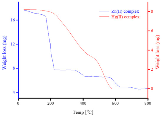 The thermal stability of the Zn2+ and Hg2+ complexes was assessed by subjecting the complexes to TG analysis. Several thermodynamic constants were evaluated graphically from the TG curves obtained using the Coats–Redfern (CR) [92] and Horowitz–Metzger (HM) [93] equations. The thermodynamic constants include the Gibbs free energy of activation (ΔG*), activation energy (E*), the entropy of activation (ΔS*), and the enthalpy of activation (ΔH*). Figure 11, Figure 12, and Figure 13, respectively, contain the TG thermograms of the Zn2+ and Hg2+ complexes, thermodynamic graphs of the complexes derived using the CR method, and thermodynamic graphs of the complexes derived from the HM method. The Zn2+ complex decomposed in three steps, but around 56% of its total weight was released and pyrolyzed in the first degradation step. This complex was thermally stable in air up to 150 °C and its three degradation steps occurred at 150–250 °C, 250–480 °C, and 480–660 °C, corresponding to weight losses of 56.36%, 6.00%, and 9.23%, respectively. The decomposition of the complex was nearly complete by ~660 °C leaving zinc oxide contaminated with a large amount of residual carbon. The final decomposition products resulting from the combustion of the complex were 2ZnO + 30C, reflected in an observed weight loss of approximately 28.05% (calculated to be 28.21%). The Hg2+ complex was more thermally stable than the Zn2+ complex. The TG profile of this complex indicated that it remained thermally stable until 200 °C and, from there, it completely decomposed in two stages ending by ~577 °C. The two stages occurred in the temperature ranges of 200–350 and 350–577 °C, which corresponded to weight losses of 38.53% and 61.40%, respectively. The total weight loss from these two stages was close to 100.0%, which indicated that the Hg2+ complex underwent complete combustion with no residual metal oxide or carbon remaining, in contrast to the degradation of the Zn2+ complex. The mercury metal in the Hg2+ complex was likely released as mercury vapor, mercury chloride, or volatile metalloorganic derivatives. The latter is most likely, given the large amounts of carbon and hydrogen contained in the complex.