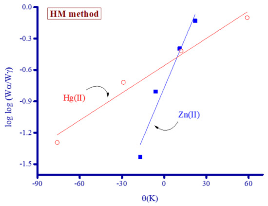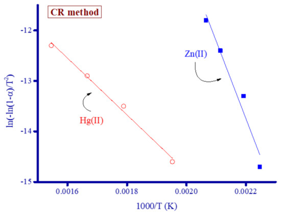The thermodynamic constants ΔG*, E*, ΔS*, and ΔH* were calculated for the Zn2+ and Hg2+ complexes using the CR and HM equations (Table 1). The value of E* was derived from the slopes of the lines generated using Equations (1) and (2) for the CR and HM methods, respectively.
