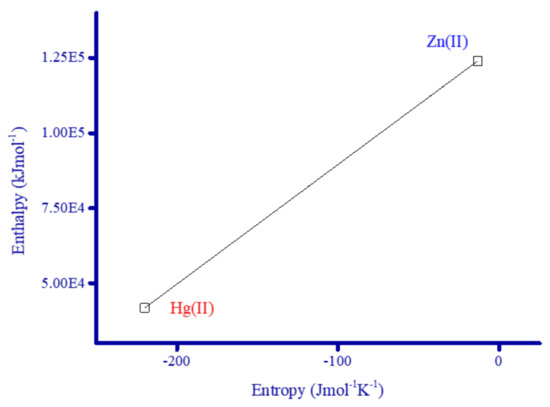 The full form of the symbols in these equations are: Ts—DTG peak temperature; h—Planck’s constant; k—Boltzmann’s constant; R—gas constant; T—derivative peak temperature; ϕ—linear heating rate; α—fraction of the product decomposed at time t; wγ—equal to wα—w; θ—equal to (T − Ts); w—mass loss at time t; and wα—mass loss after the reaction. The data listed in Table 1 revealed that the thermodynamic constants derived using both methods (HM and CR) for the main complex decomposition stage were comparable. Both E* values were very close to the corresponding ΔH* values. Increasing the thermal stability of a complex increased its Gibbs free energy of activation (ΔG). The ΔG value for the Hg2+ complex was 1.71 × 105 J mol−1, higher than the Zn2+ complex (1.30 × 105 J mol−1), which reflected the increased thermal stability of the Hg2+ complex. The values of ΔS* for both complexes were negative, indicated that the reaction was slower than normal or that the activated complexes are more ordered than that of either of the reactants [94]. The values of ΔH*, and ΔG* for both complexes were positive, suggesting that FCD and the investigated metal ions reacted non-spontaneously to form thermally stable complexes and the decomposition process was endothermic [94,95]. An extraordinarily strong linear correlation (r = 1) is observed between the values of entropy (ΔS*) and enthalpy (ΔH*) (Figure 14).