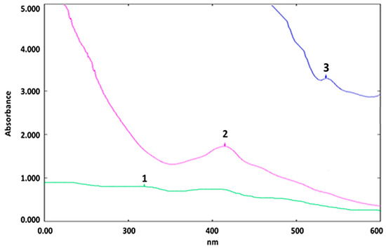 The success of synthesis of AgNPs was based on results of visual inspection and UV–Visible spectrometric analysis. For color shift control, mixtures of AgNO3 solution and CIL extract were held apart for 60 min at 60 °C. The change in color from yellow to brown after 60 min indicated the formation of AgNPs. The formation of AgNP in brown color solution was further confirmed by UV–Visible analysis, which generated an absorption spectrum comprising curves 1, 2, and 3 (Figure 1). Curve 1 represented the AgNO3, curve 2 represented AgNP, and curve 3 represented CIL extract solution. The presence of an SPR peak at 425 in curve 2 of the UV–Visible spectrum confirmed formation of AgNPs. In the spectrum, curve 3 of the CIL extract did not exhibit a signal near 425 nm.