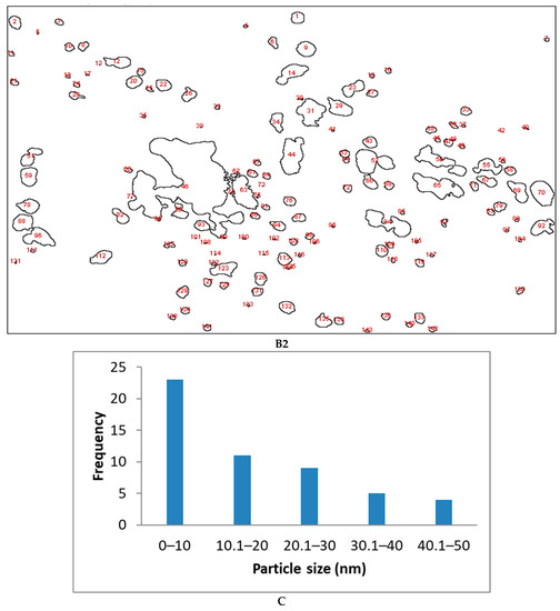 The SEM and TEM derived size distribution histogram data assisted in the determination of the size and shape of AgNPs. The SEM data given in Figure 2A indicated that synthesized AgNP are spherical in shape and poly-dispersed. The average size distribution histogram based on TEM data (given in Figure 2(B1,B2,C), and Table 1) revealed AgNPs to exist in sizes ranging between 1 and 50 nm.