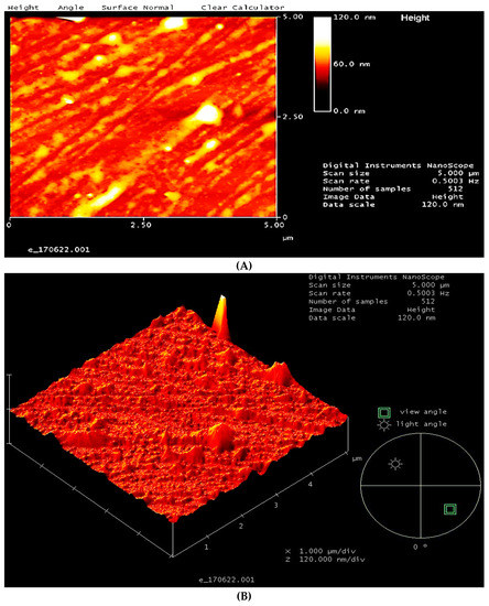 Scanning of AgNPs in tapping mode generated two-dimensional (2D) (Figure 3A and three-dimensional (3D) (Figure 3B images. The images confirmed the uniform distribution of AgNPs, as most of the particles sizes were consistent with the SEM and TEM measurements.