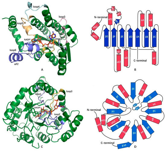 Comparison of structures (A,C) and folding topologies (B,D) of hydroxysteroid dehydrogenases (HSDHs) from short-chain dehydrogenase/reductase (SDR) superfamily (7β–HSDH(PDB:5GT9)) and aldo–keto reductase (AKR) superfamily (3α–HSDH(PDB:4L1X)). A–helixes are represented as cylinders (in red) and β-sheets are represented as arrows (in blue). Several important loops related to coenzyme or substrate binding between α-helixes and β–sheets are labeled, which are loop1–6 between β(A–F)–α(A–F) in 7β–HSDH and loop1 (βA–αA), loop2 (βG–αG1) and loop3 (βH–αH1) in 3α–HSDH. Figures A and C were created by Pymol [14].