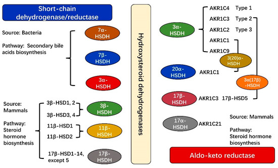 This article reviews the HSDHs from SDR and AKR superfamilies that were identified in mammals and bacteria and then classifies the HSDHs according to their functions in steroid hormone metabolism or bile acid biosynthesis. The differences of NAD(P)(H)-binding models to enzymes and enzymatic reaction characteristics between SDR and AKR superfamilies were also summarized. A semi-flexible molecular docking was used for further exploration of differences of substrate binding model to enzyme–coenzyme complex between SDR and AKR superfamilies, in addition to the reasons of stereospecificity of substrate or product in HSDHs.