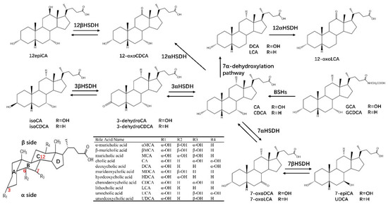 Bile acids serve significant roles in cholesterol metabolism and the digestion of lipids for mammals [28]. The composition of bile acids pools is different in different species. For example, the human bile acids pool is usually composed of hydrophobic bile acids cholic acid (CA), chenodeoxycholic acid (CDCA), deoxycholic acid (DCA), and lithocholic acid (LCA), whereas the mice bile acids pool mainly consists of hydrophilic bile acids, muricholic acids(β–MCA) and ursodeoxycholic acid (UDCA) [17,29,30]. All these bile acids can be divided into two forms-primary bile acids (CA and CDCA) and secondary bile acids (DCA, LCA, UDCA, etc.), whose production is related to the activities of the liver and intestinal microbiota, respectively [31].