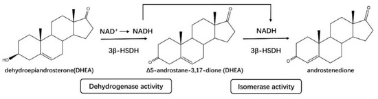 3β–HSDHs (EC 1.1.1.145) have been identified in Homo sapiens (type 1–2), Mus musculus (type 1–6), Rattus norvegicus (type 1–4), Mycobacterium tuberculosis, etc., usually with activities of dehydrogenase and isomerase (Δ5–Δ4) [37]. Both Human type 1 3β–HSD1/isomerase and type 2 3β–HSD2/isomerase are NAD(H)-dependent enzymes, catalyzing the conversion of 3β-hydroxy-5-ene-steroids to 3-oxo-4-ene-steroids with two sequential enzymatic reactions. Firstly, 3β–HSDH catalyzes the dehydrogenation of 3β-hydroxysteroid to a 3-oxo intermediate, and then the Δ5-form intermediate was isomerized to Δ4-form via their isomerase activity (Figure 4). This catalytic function of 3β–HSDH is usually related to the conversation of dehydroepiandrosterone (DHEA) to androstenedione, 17α–hydroxypregnenolone to 17α–hydroxyprogesterone and pregnenolone to progesterone [38,39,40]. In humans, 3β–HSD1 (type 1) and 3β–HSD2 (type 2) are encoded by two distinct genes which are expressed in a tissue-specific pattern [41]. 3β–HSD1 is expressed in peripheral tissues such as breast, placenta, prostate, and endometrium, with roles of production of some downstream steroids such as testosterone, dihydrotestosterone (DHT), and estrogens [42]. The testosterone and estradiol will promote the growth of breast tumors [43] and prostate tumors [44]; therefore, human 3β–HSD1 is a potential target for the inhibition of estradiol production in breast tumors and testosterone production in prostate tumors. 3β–HSD2 is expressed in adrenals, ovaries, and testis, which are related to the synthesis of steroid precursors required for the production of cortisol, aldosterone, and the female and male sex hormones [17,29,31].