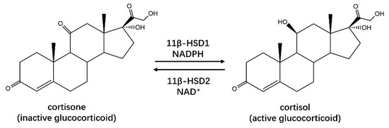 11β–HSDHs (EC 1.1.1.146) in humans can be generally divided into two types, 11β–HSD1 and 11β–HSD2, working together on glucocorticoid metabolism to regulate the availability of active glucocorticoids [45]. 11β–HSD1 is NADP(H)-dependent enzyme, facilitating the conversion of inactive glucocorticoids, cortisone in human and 11-deoxycorticosterone in rodents, to their active 11-keto metabolites, cortisol, and corticosterone, respectively [46] (Figure 5). 11β–HSD1 is mainly expressed in liver, adipose tissues, brain and skeletal muscles [47], whose function associated with insulin resistance, dyslipidemia, obesity, hypertension, and other features of mineralocorticoid excess; hence, the inhibition of 11β–HSD1 is a potential method for the treatment of glucocorticoid (active)-related disorders [48,49]. 11β–HSD2 was found primarily in mineralocorticoid target tissues, such as kidneys, sweat glands, salivary glands, and colonic mucosa [50], catalyzing the conversion of glucocorticoids to inactive 11-ketosteroids in a NAD(H)-dependent activity, in contrast to 11β–HSD1 [51]. Another type of 11β–HSDH, 11β–HSD3, has been identified in zebrafish, fathead minnow, and some paralogs amphioxus [52].