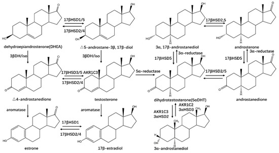 17β–HSDHs are encoded by non-homologous genes with different subcellular localizations, coenzymes, and substrate preferences [53]. Up to now, over 14 different subtypes of 17β–HSDHs (17β–HSD1–14) have been identified, most of them belong to the SDR superfamily except 17β–HSD5, which is a member of the AKR superfamily [54,55]. All 17β–HSDHs are able to catalyze the reduced or oxidized reactions at position C17 of C18– or C19–steroids, involved in the activation and inactivation of steroid hormones (Figure 6) [54]. 17β–HSD1 could catalyze the activation of estrone to estradiol in humans. However, the production of estradiol is linked to the development of diseases such as breast cancer, ovarian tumor, endometriosis, endometrial hyperplasia, and uterine leiomyoma [56]. It was demonstrated that estradiol can be converted to genotoxic metabolites in breast tissue. Consequently, the inhibition of 17β–HSD1 is one of the treatments for breast cancer in clinical [57]. Meanwhile, the decreasing of estradiol will lead to osteoporosis. 17β–HSD2 have opposing actions to 17β–HSD1, catalyzing the inactivation of estradiol to estrone, which means the inhibition of 17β–HSD2 is one of the therapies for osteoporosis [58]. Otherwise, 17β–HSD1 could catalyze the conversion of dehydroepiandrosterone (DHEA) to Δ5–androstane–3β, 17β–diol while 17β–HSD2 catalyze a reverse reaction. Δ5–androstane-3β, 17β–diol can be converted to estradiol with functions of 3β–HSDH and aromatase [59]. 17β–HSD3 exists predominantly in testis and catalyzes the conversion of Δ4–androsenedione to testosterone. It was confirmed that its mRNA was overexpressed in prostate cancer tissue. Testosterone is responsible for cell proliferation in androgen-dependent diseases, and the inhibition of 17β–HSD3 is effective for the treatment of diseases such as prostate cancer [60]. The functions of other subtypes of 17β–HSDH were described in Table S3.