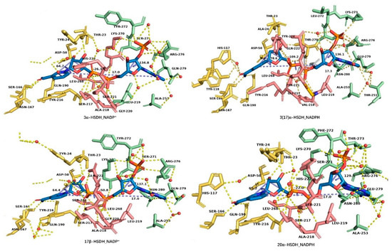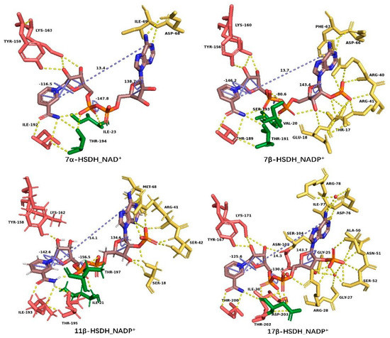 The interactions between AKR–HSDHs and coenzymes in the binary or ternary structures of 3α–HSDH (PDB: 1J96), 3(17)α–HSDH (PDB: 2P5N), 17β–HSDH (PDB: 1ZQ5), and 20α–HSDH (PDB: 1Q5M) were analyzed using Pymol (distributed by Schrödinger, New york, NY, US) (Figure 9) [14], to explore the conformation changes of NADP(H) after binding to the enzyme and whether these changes are conservative in all AKR–HSDHs. The conformation of NADP(H) is highly conserved in AKRs, showing little difference. The distance between C6 of adenine and C2 of nicotinamide is 17.0 Å, which means the occurrence of structural extension of NADPH (15.6 Å) due to the interactions between residues and coenzyme, such as hydrogen bonds, π–π interactions, and hydrophobic interactions [101], and it is definitely different from SDR–HSDHs, which is roughly 14 Å. Other structural changes and interacted residues are described in Table S4, which demonstrated high similarity and conservation in 3α–HSDH, 3(17)α–HSDH, 3α(17β)–HSDH, 17β–HSDH, and 20α–HSDH.