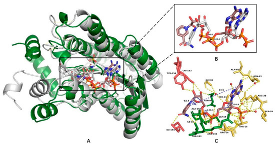 Taking the 3α–HSDH holo-form (PDB: 1J96), for example, the adenine ribose group in AKR–HSDHs is embedded between αG1-helix and αH-helix, interacted with residues of Ala253 from αG1-helix, Arg276, and Gln279 from αH-helix, while the O2’ ribose phosphate group was contained in the cavity formed by Lys70–Ser271–Tyr272 on the loop 1 and Arg276 on αH-helix. These residues and the water molecules formed a hydrogen bond network with the adenosine ribose group, which helps to fix the adenosine ribose group at the N-terminal. All these interactions are highly conserved in AKR–HSDHs, especially the interactions between Ala253, Arg276, and coenzymes, for example, the interactions [Ala253–N⋯3.1Å⋯H2O⋯3.1Å⋯N1A–adenosine] and [Arg276–NH2⋯3.0Å⋯O2X–Phosphate group] [102,103,104].
