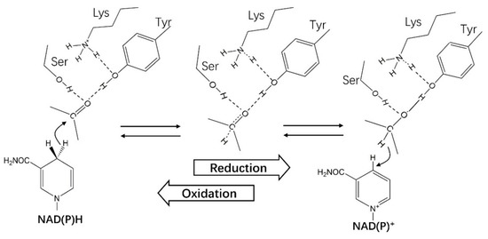 A “push–pull” catalytic mechanism was proposed to explanate the reduced and oxidated reactions of AKRs (Figure 11) [119]. In a reduction direction at pH 6.0, the side chain amino group(–NH2) of Lys was protonated, which was then interacted with the phenolic group (–OH) of Tyr. In the meantime, the imidazole group of His attracted hydrogen at 3-N position, which was also interacted with the phenolic group (–OH) of Tyr. These two interactions ultimately reduce the pKa value of Tyr and promote the transfer of protons. Meanwhile, the Asp also participates in the reaction through a salt bridge to Lys. In an oxidation direction, the interaction between –COO– of Asp and –NH2 of Lys promotes the abstraction of Tyr phenolate anion to hydrogen from the steroid alcohol [113,114,115,116,117,118,119,120].