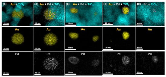 EDXS images taken in STEM mode representative of (a) Au, (b) Au0.9Pd0.1, (c) AuPd, (d) Au0.25Pd0.75, and (e) Pd NPs on a TiO2 support, with the Au, Pd, and TiO2 shown in yellow, gray, and teal, respectively.