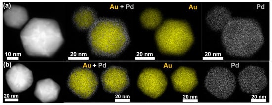STEM-HAADF images and correlated EDXS maps of AuCore NPs with (a) 10% AuPdShell and (b) 10% PdShell, with the Au and Pd shown in yellow and gray, respectively.
