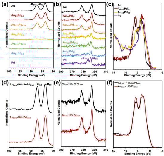 XPS analysis of the (a–c) Au1−xPdxalloys and (d–f) AuCore–Au1−xPdx.Shell NPs for the (a,d) Au 4f, (b,e) Pd 3d, and (c,f) VB regions.