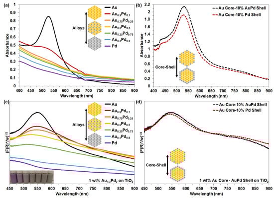 UV–Vis spectra of (a) Au1−xPdxand (b) AuCore–Au1−xPdx.Shell NPs in solution. UV–Vis DRS of 1 wt.% (c) Au1−xPdx NPs and (d) AuCore NPs with 10% Au0.5Pd0.5.Shell and 10% Pd.Shell on TiO2 supports, with inset image of Au1−xPdxalloy NPs on TiO2 in a slurry mixture.