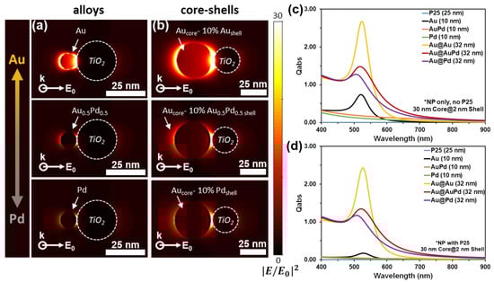 DDA simulations of the spatial distributions of the electric field enhancement (|E/E0|2) for spherical (a) Au1−xPdx and (b) AuCore–Au1−xPdx.Shell NPs in contact with a spherical TiO2 NP under resonance wavelength excitation. Wave vector is incident into the image. DDA simulated absorption efficiency (Qabs) spectra for (c) Au–Pd NPs only and (d) Au–Pd NPs in contact with TiO2.