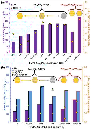 Suspended particle photocatalysis of metal-oxide semiconductors is initiated by the absorption of photons to induce charge separation and diffusion of the photogenerated carriers to surface active sites to react with adsorbed chemical species [,,,]. Metal-oxide TiO2 supports were photosensitized with homogeneously alloyed Au1−xPdx and heterogeneous AuCore–Au1−xPdx.Shell NPs to be used as hybrid photoreactors for EtOH photo-oxidation. Plasmon-mediated photocatalytic EOR performance measurements were conducted under solar-simulated (AM1.5G) irradiation for 1–4 h, while the gaseous oxidation products were measured using a GC-MS-MHE analysis method [,]. Thermal background measurements were collected under dark conditions for each sample by heating the photoreactor at 60 °C to thermal equilibrium, which yielded negligible oxidation of EtOH. Plasmonically enhanced photocatalytic mass activities for Au1−xPdx and AuCore–Au1−xPdx.Shell NPs dispersed on TiO2 are shown in Figure 6, Table 1, and in Supplementary Tables S2 and S3 for the oxidation products of EtOH conversion, acetaldehyde (CH3CHO, n = 2e−) and carbon dioxide (CO2, n = 12e−). In Figure 6, the mass activity for CO2 is plotted on the left axis represented by purple (1 h) and blue (4 h) bars, while the mass activity for CH3CHO is plotted on the right axis represented by orange diamond (1 h) and green triangle (4 h) markers.