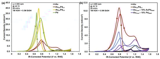 Electrochemical CVs for EtOH oxidation catalyzed by 20 wt.% (a) Au1−xPdx and (b) AuCore–Au1−xPdx.Shell NPs dispersed on carbon supports deposited onto a rotating disk, glassy carbon working electrode. Reference and counter electrodes were Ag/AgCl and a Pt coil, respectively, immersed in 0.5 M EtOH with 1 M KOH supporting electrolyte.