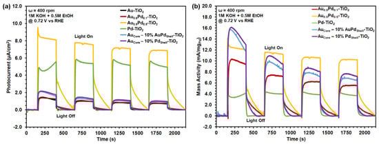The selected Au1−xPdxalloys and AuCore–Au1−xPdx.Shell NPs were further investigated by CV and chronoamperometry (CA) for their SPR-induced photoelectrochemical (PEC) EOR by photosensitizing TiO2 supports. CV scans in the dark and under AM1.5G irradiation are shown in Supplementary Figures S10–S12. Catalytic metals like Pt and Pd enhance the extraction and use of plasmonic carriers generated in Au [,,,,,,,]. Furthermore, hot electron transfer and photothermal processes can facilitate intermediate removal during irradiation [,,]. Elucidation of the role of SPR effects on EOR motivated solar-simulated CA photocurrent studies. Plasmon-enhanced EOR photocurrents were measured via CA scans on a RDE immersed in 0.5 M EtOH (1 M KOH supporting electrolyte, 25 °C) for current density (Figure 8a) and mass activity (Figure 8b) measurements. CA measurements were held at a bias of appreciable current (+0.72 V vs. RHE), with 250 s on/off chopping of broadband AM1.5G irradiation. Applied potential improves electron transport to the back contact and decreases the surface recombination rate, while demonstrating appreciable EOR current for both alloy and core–shell compositions of interest. Analyses focus on the average photocurrent magnitude measured during the first “light on” step and after 1900 s chopped irradiance, as shown in Figure 8 and in Supplementary Tables S4 and S5.