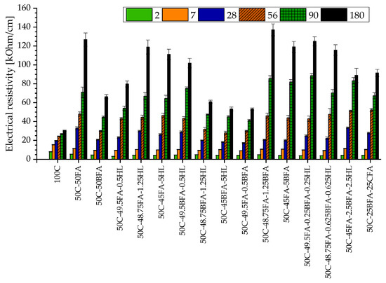 The electric resistivity was measured for each mortar formulation, and its results are presented in Figure 1. The electric resistivity is affected by several parameters such as the free water content, the origin and the concentration of ionic species in the pore solution, the amount of hydration products, the particle size, and the specific surface area of raw materials [71].