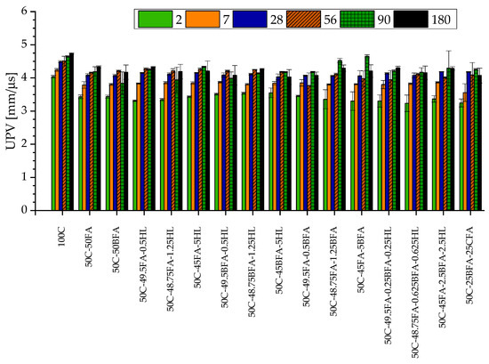 The UPV increased with curing time in all samples until 90 days of curing. The maximum velocity was obtained in the reference sample for all curing periods. The decrease in velocity for mortars with the fly ashes reveals that the compressive strength of samples with ashes had lesser compressive strength than the plain cement mortars. The UPV depends on the density and elastic properties of the building materials [62,83,84]. As the UPV is influenced by the heterogeneity of samples, such as the presence of voids, the reduction of this parameter in mortars with BFA (Figure 2 and Figure 3) showed that these samples were more heterogeneous. The UPV is related to the strength of the material, so a decrease in this parameter indicates a decrease in its mechanical strength [85].