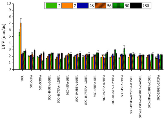 UPV values from the direct method for the different mortar formulations for 2, 7, 28, 56, 90, and 180 of curing.