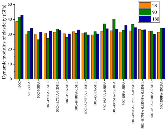 The values observed, for each curing age, represent the average of three measurements on each sample. Mortars with CFA or/and BFA present lower values for the dynamic modulus of elasticity than that of reference mortar, for all curing ages. These results showed that the introduction of ashes as cement substitution has a significant effect on some mortar properties, such as the reduction of the hardened concrete density and the increase of heterogeneity of the resulting mortar [64].