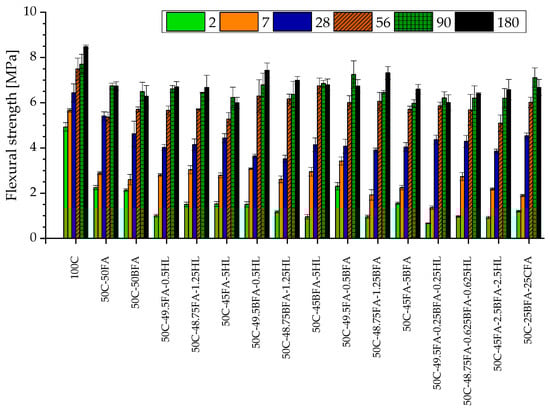 Evaluation of flexural strength values of mortars with the curing period for 2, 7, 28, 56, 90, and 180 of curing.