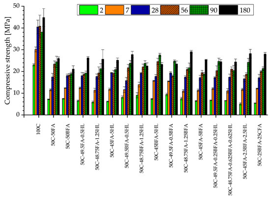 The introduction of HL in mortars with CFA does not have a significant improvement in the strength of mortar when compared to the plain cement one. An increase in the compressive strength at early ages was observed for mortars with HL and CFA. This can be due to the breaking down of CFA particles at the high calcium hydroxide content and the inner silicate phase becoming suitable for the hydration reaction with the production of more calcium silicate hydrates [94]. However, its introduction in mortars with BFA leads to an increase in the mortar strength, being the cement substitution of 1.25% by HL, the content that provides the best results for the different curing ages.