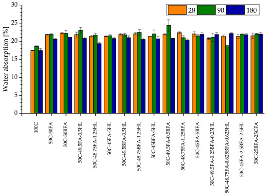 Mortars with CFA and HL present lower water absorption than the reference. The lower values were achieved for the mortar with 1.25% of HL for 28 days curing, with 0.5% for 90 days, and with 5% of HL for 180 days of curing. In the case of mortars with BFA and HL, the mixtures with 0.5% and 5% presented higher values than the reference, but the composition with 1.25% presented lower values, for 28 days curing. However, all the formulations presented lower values than the mortars made only with BFA. In mortars with 90 days of curing, the best results were achieved for mortars with 0.5% of HL. At 180 days of curing, all the mortars with BFA and HL presented higher values than the reference and mortars made only with BFA. This phenomenon is contrary to the results observed for 28 days of curing.
