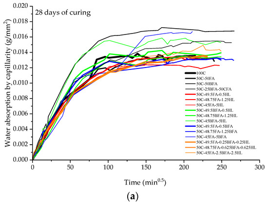 The water absorption coefficient by capillarity was measured by placing the specimens in a box with the broken face of the prism downwards and immersed in water with a depth of 5 mm during the test; the other faces were covered with silicone to ensure that the water just enters in the sample by the capillaries of the face in contact with water. The water level was maintained through the test. Several weight measures were done: 0, 0.08, 0.17, 0.25, 0.33, 0.5, 0.75, 1, 1.5, 2, 2.5, 3–7, 24, 48, 72, 96, 120, 144, and 168 h. After 168 h of testing, the specimens were weighed every 7 days until a constant weight was reached. The water absorption by capillarity is determined by the calculation of the slope of the linear regression line that linked the points related to the measures carried out between 10 and 90 min [67,70].
