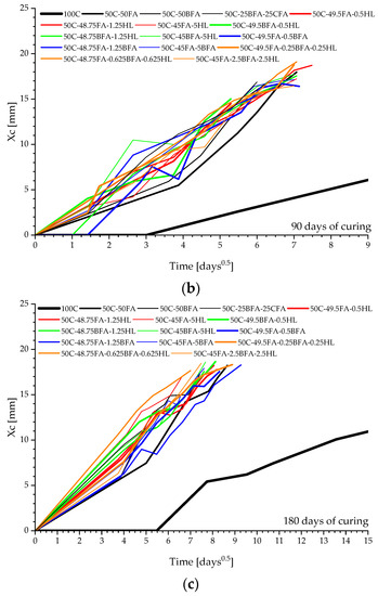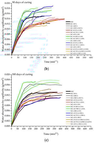 Curves for the capillarity absorption of mortars cured for (a) 28, (b) 90, and (c) 180 days of curing.