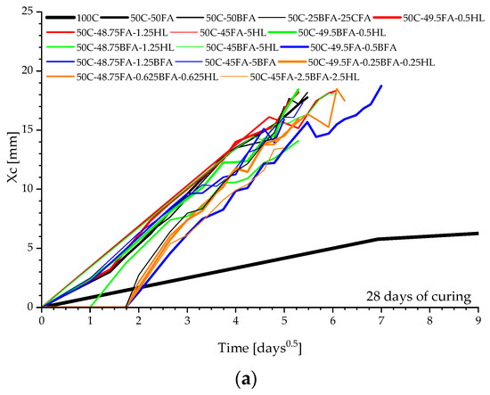 For the carbonation test, the cured samples were preconditioned in an isolated container subjected to a constant temperature and relative humidity (RH) (88.0 ± 4.0% and 17.5 ± 1.6 °C) for 14 days, to ensure the stabilization of humidity within the samples. After this period, the samples were sealed with paraffin, except for two opposed faces, and placed in a chamber to test the accelerated carbonation (4.2 ± 0.1%wt of CO2, 52.6 ± 8.3% RH, and 20.0 ± 0.8 °C). To measure the carbonation depth, several cross sections were taken by diametric compression, and after they were sprayed with a phenolphthalein indicator.