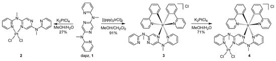 In a previous work, we reported a bis-bidentate ligand dapz (dapz = 2,5-di(N-methyl-N′-(pyrid-2-yl)amino)pyrazine; Figure 1) with a larger bite angle and its application in the synthesis of a dual-emissive mononuclear ruthenium complex [34]. To extend our research interest in the development of dual-emissive TMCs, an IrIII-PtII heterodimetallic complex [(ppy)2Ir(dapz)PtCl2]Cl (4) and the corresponding monometallic complexes [(ppy)2Ir(dapz)]Cl (3) and [(dapz)PtCl2] (2) were designed and prepared. The photophysical properties of these complexes are presented herein. Moreover, density functional theory (DFT) and time-dependent DFT (TDDFT) calculations were performed and are discussed.