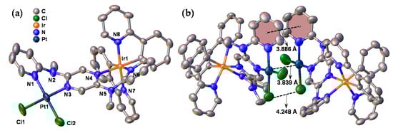 The structure of complex 4 was also confirmed by single-crystal X-ray analysis. The ORTEP and crystal packing of 4 are shown in Figure 2. Corresponding crystallographic data are summarized in Tables S1 and S2. The single crystal of 4 was obtained by the slow diffusion of diethyl ether into a solution of 4 in acetonitrile. The Ir atom adopts a distorted octahedral configuration surrounded by dapz and two ppy ligands, whereas the Pt atom possesses a square planar coordination geometry. The N-Ir-N bite angle with the dapz ligand (85.94(14)°) is slightly larger with respect to the C-Ir-N bite angles associated with two ppy ligands (80.44(15) and 80.63(16)° respectively). The N-Pt-N bite angle with the dapz ligand (87.95(16)°) is also larger than those of most platinum complexes with N∧N bidentate ligands, which fall in the range of 77.5(2)–79.02(14)° [40,41,42]. The Ir-N bond lengths with dapz (2.167(4) and 2.174(3) Å) are slightly longer than the Ir-C bond lengths with ppy (2.063(3) and 2.055(3) Å). The Pt-N bond lengths with dapz (2.007(4) and 2.032(5) Å) are similar to those of known platinum complexes [38,40,41,42]. As suggested by Figure 2b, the intermolecular Cl∙∙∙Cl distance is 4.248 Å, indicating the absence of Cl∙∙∙Cl interaction. The intermolecular aromatic plane∙∙∙plane and Pt∙∙∙Pt distances of complex 4 are 3.886 and 3.839 Å, respectively. The distance is slightly larger than, but close to, the Pt∙∙∙Pt interaction distance [43,44] and conventional π–π stacking [45]. This suggests that the intermolecular π–π and Pt∙∙∙Pt interactions, if present, are rather weak in the crystal of complex 4.