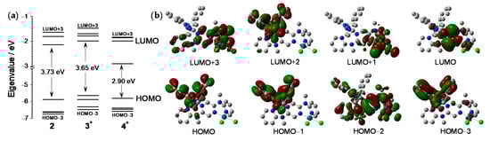 (a) UV/vis absorption spectra of 1–4 in acetonitrile at a concentration of 5.0 × 10−6 M. (b) Time-dependent DFT (TDDFT) results of complex 4+.