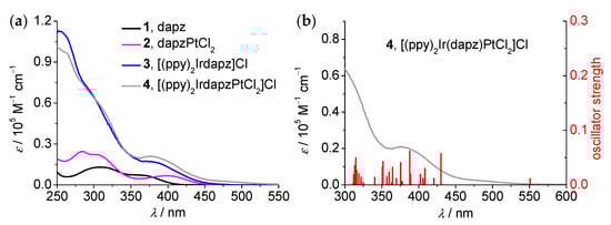 The electronic absorption spectra of compounds 1–4 are displayed in Figure 4a. Corresponding data, including absorption maxima and molar absorption coefficients, are delineated in Table 1. Transitions in the UV region are largely caused by intraligand π–π* excitations, while the absorption bands in the visible region are attributed to charge transfer (CT) transitions. The lower-energy side of the visible absorptions of the dimetallic complex 4 extends to the region with wavelengths longer than 500 nm, which are distinctly red-shifted with respect to that of 1–3. This is in agreement with the above DFT calculations showing that complex 4 has the narrowest energy gap.
