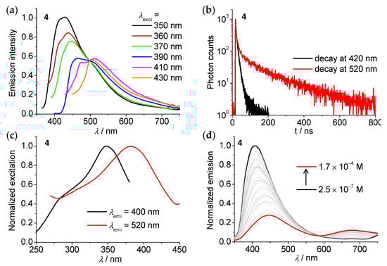 (a) Emission spectra of 4 excited at different wavelengths indicated (5 × 10−6 M in CH3CN). (b) Emission decay profiles of 4 at different emission wavelengths indicated. Excited at 350 nm. (c) Excitation spectra of the emission at 400 and 520 nm of 4. (d) Emission spectra of 4 in CH3CN upon increasing the concentration from 2.5 × 10−7 to 1.7 × 10−4 M.