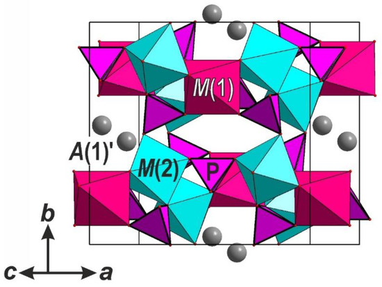 where x = 0–1. The derivative of the alluaudite-type framework containing occupied A(1)′ sites is described by the formula (10) and can be denoted as the johillerite-type (by the analogy with the mineral johillerite, NaCuMgMg2(AsO4)3 [63,64]), while the derivative with the occupied A(2) sites and the formula (11) is denoted as the KCd3(VO4)3-type [52,65]. Taking into account that both derivatives also contain bridging pII-type X-ligands that can be partially protonated, Formulas (10) and (11) can be modified as: