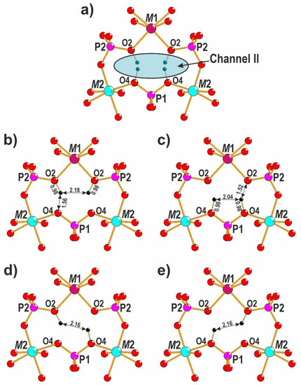 In the crystal structure of 1, channel II is filled only by statistically disordered hydrogen atoms of P1Ø4- and P2Ø4-tetrahedra (Figure 2a). The strong hydrogen bonds are formed between O2-oxygens and O4-oxygens with the distance O2⋯O4 = 2.482(7) Å and possible local distributions of hydrogens are shown in Figure 2b–e. Based on the Libowitzky equations [53]: