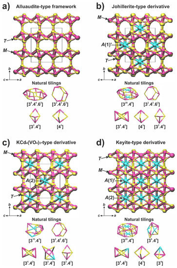 An ‘empty’ parent alluaudite-type framework consists of four natural tilings: (2T3M)-[43] (formed by two T-cations and three M-cations), (2T3M)-[32.42], (4T5M)-[32.42.62], and (6T8M)-[38.44.62] (Figure 4a). The occupancy of the A sites by additional transition metal cations changes the topology of its derivatives significantly. The johillerite-type derivative (with the occupied A(1)′-site in channel I) is formed by five types of natural tiles. Among them, the (2T3M)-[43], (2T3M)-[32.42], and (4T5M)-[32.42.62] tilings are identical to those in the parent alluaudite-type framework, while the (6T8M2A)-[320.44] and (2T4M)-[34.42] tilings are unique (Figure 4b). The KCd4(VO4)3-type derivative (the A(2)-site is occupied in channel II) is also characterized by the presence of five types of tilings: the (2T3M)-[32.42] and (4T5M)-[32.42.62] tilings are identical to those of the parent framework, while the (3T5M2A)-[310.43], (3T2M1A)-[32.43], and (2T4M)-[34.42] tilings are unique (Figure 4c). In the keyite-type derivative (both channels I and II are filled by cations at the A(1)′- and A(2)-sites). There are five types of natural tilings (Figure 4d): (2T3M)-[43] is identical to that in the parent structure, while the (6T8M2A)-[320.44] tiling is identical to that in johillerite. The (1T2M1A)-[34], (2T3M1A)-[34.42] (topologically identical to other [34.42] tilings, but chemically different) and (3T3M2A)-[36.43] tilings are unique and appear due to the presence of cations in both types of channels. Comparative data on the general features of the alluaudite-type frameworks and its derivatives are summarized in Table 5.