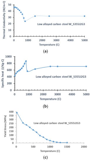Here, Q = ηVi, where V is voltage, i is electric current, and η is arc efficiency, which accounts for the radiation and other losses from the arc to the environment. The temperature-dependent material properties of the SAE-AISI 1524 carbon steel (W_S355J2G3) obtained from reference [] are plotted in Figure 1. Other properties are summarized in Table 1. Because of its high tensile strength and lower carbon content, this steel can be easily welded.